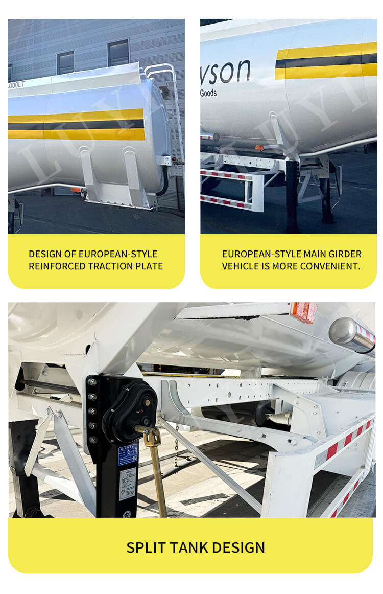 LUYI 3-Axle 3-Tank 42 000L Diesel Fuel Tank Semi-Trailer to zupełnie nowy profesjonalny sprzęt do transportu ropy naftowej, produkowany w Shandong w Chinach. Jego korpus wykonany jest ze stali o wymiarach 1065025003800mm. Konstrukcja z trzema zbiornikami umożliwia sklasyfikowany załadunek oleju napędowego, a duża pojemność 42 000 l w połączeniu z maksymalną ładownością 5 001–10 000 kg spełnia potrzeby transportu oleju o małych i średnich partiach.