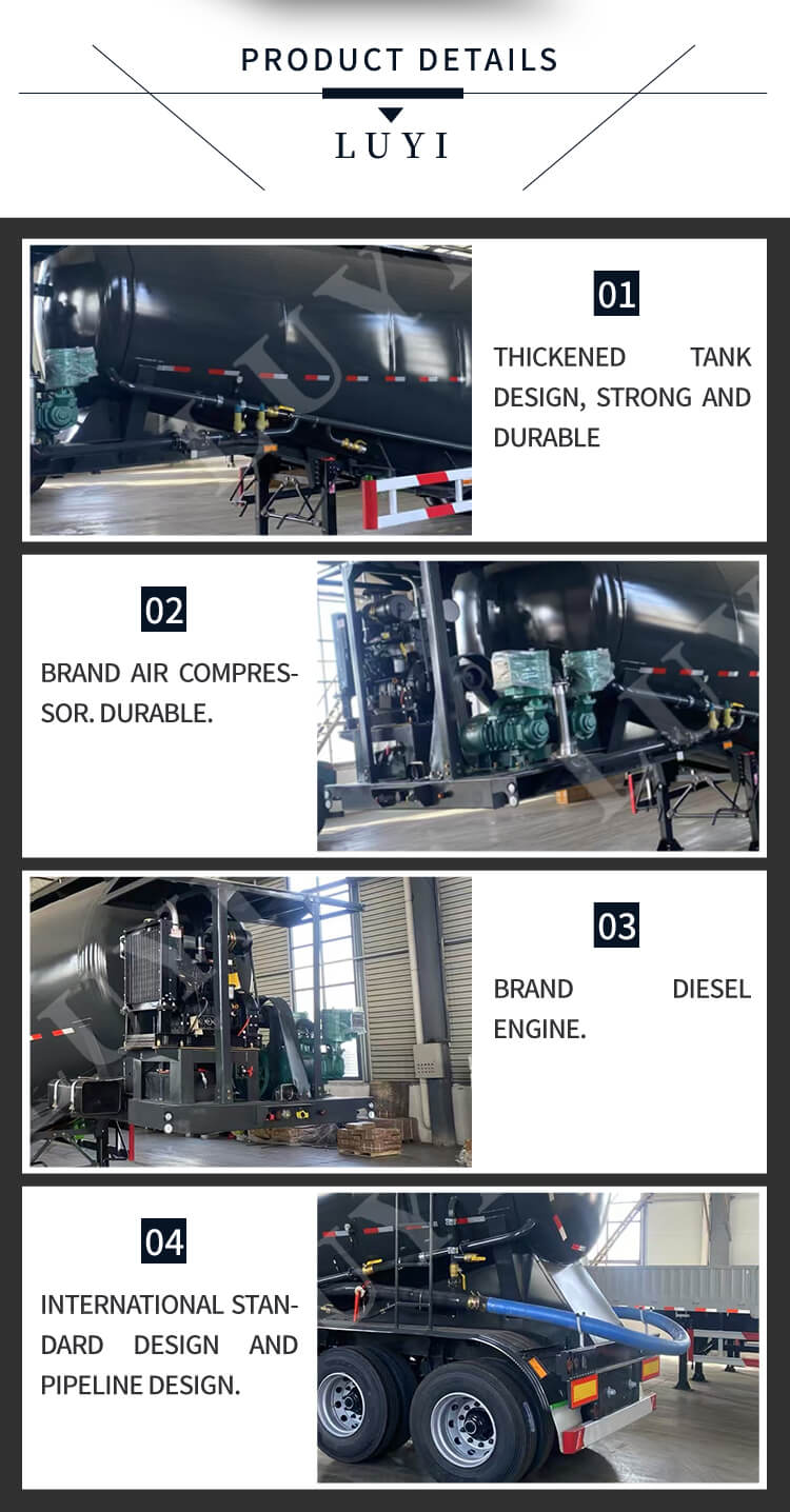 3-osiowa naczepa cementowo-cysterna Luyi o pojemności 35 metrów sześciennych, pochodząca z prowincji Shandong w Chinach, to wysokiej jakości naczepa zbudowana specjalnie do transportu cementu luzem. Ma ładowność 80 ton, ładowność efektywną od 60 ton do 80 ton i maksymalne obciążenie efektywne 80 000 kg, co może skutecznie sprostać potrzebom transportu o dużej objętości.