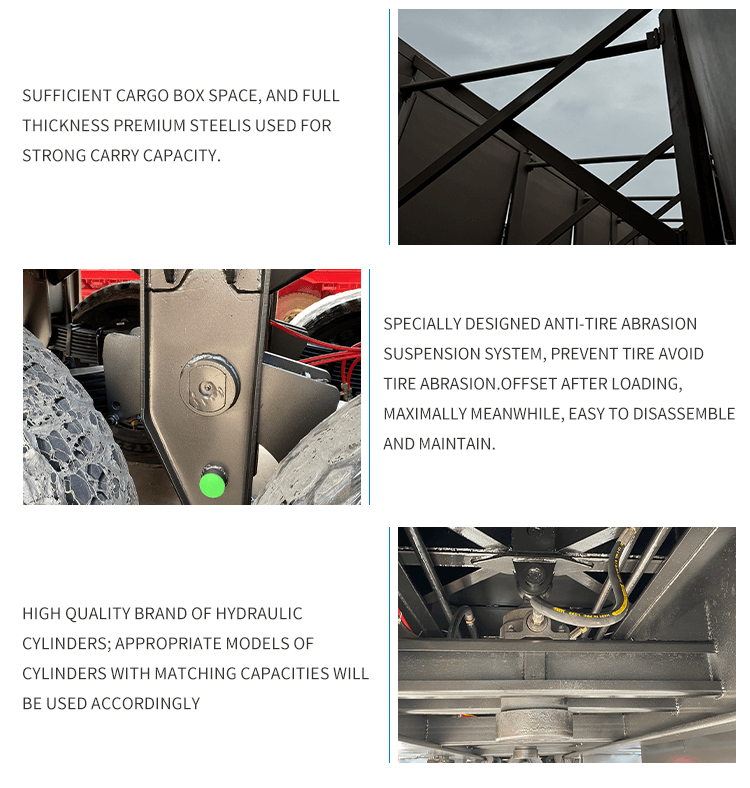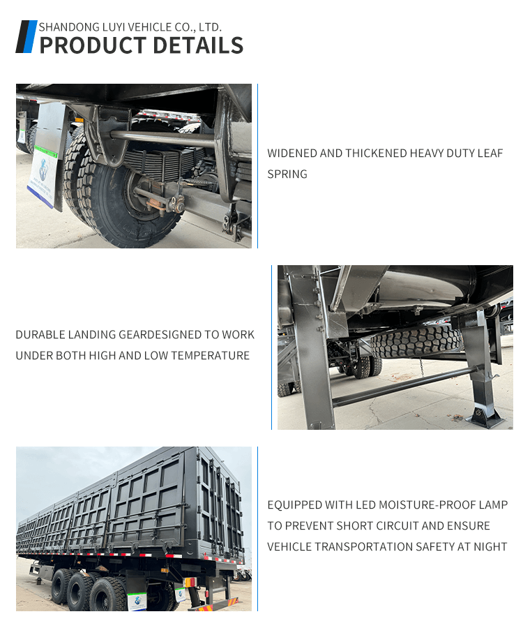 Dzięki wymiarom 11000 x 2500 x 3500 mm i maksymalnej ładowności 25001–30000 kg skutecznie spełnia wymagania dotyczące dużych obciążeń. Jest wyposażony w zawieszenie mechaniczne, resory piórowe o wymiarach 90 (szer.) mm × 13 (grubość) mm × 10 (warstwa) oraz dwuprzewodowy układ hamulcowy zapewniający stabilną i bezpieczną pracę. Standardowe podwozie 28Ton i sworzeń królewski JOST 2"(50mm)/3,5"(90mm) zwiększają możliwości adaptacyjne. Kolor i logo można dostosować, co czyni go wszechstronnym i niezawodnym wyborem w przypadku transportu ciężkiego.
