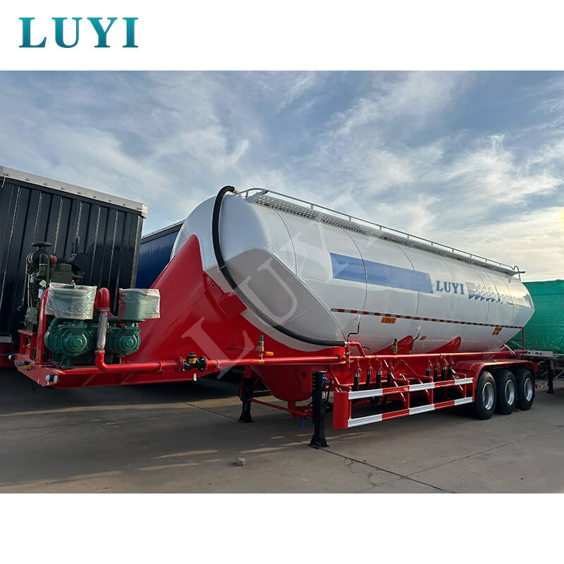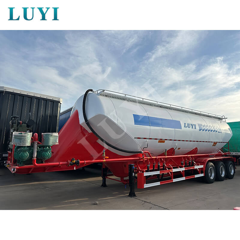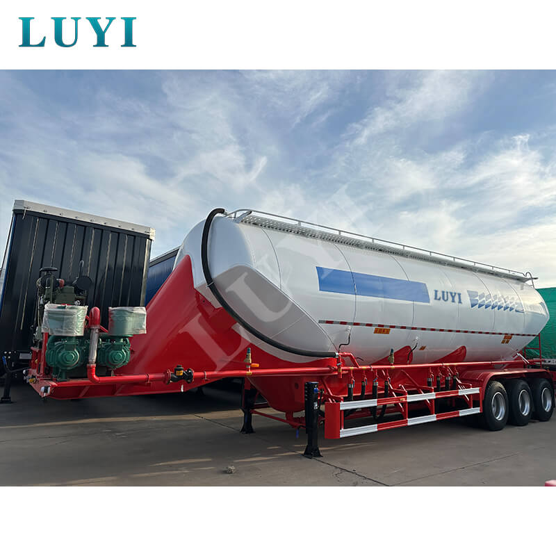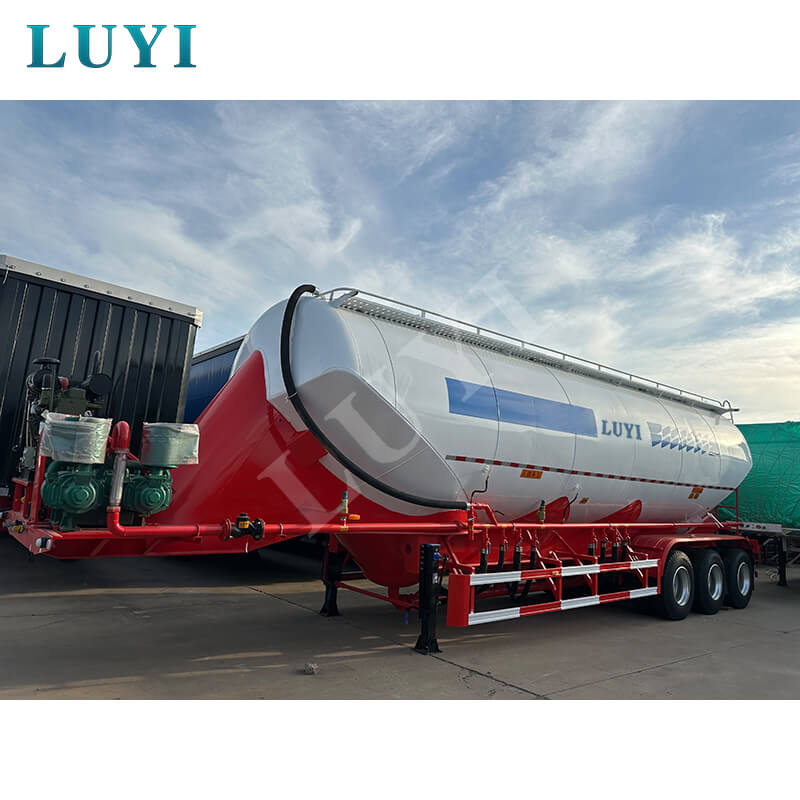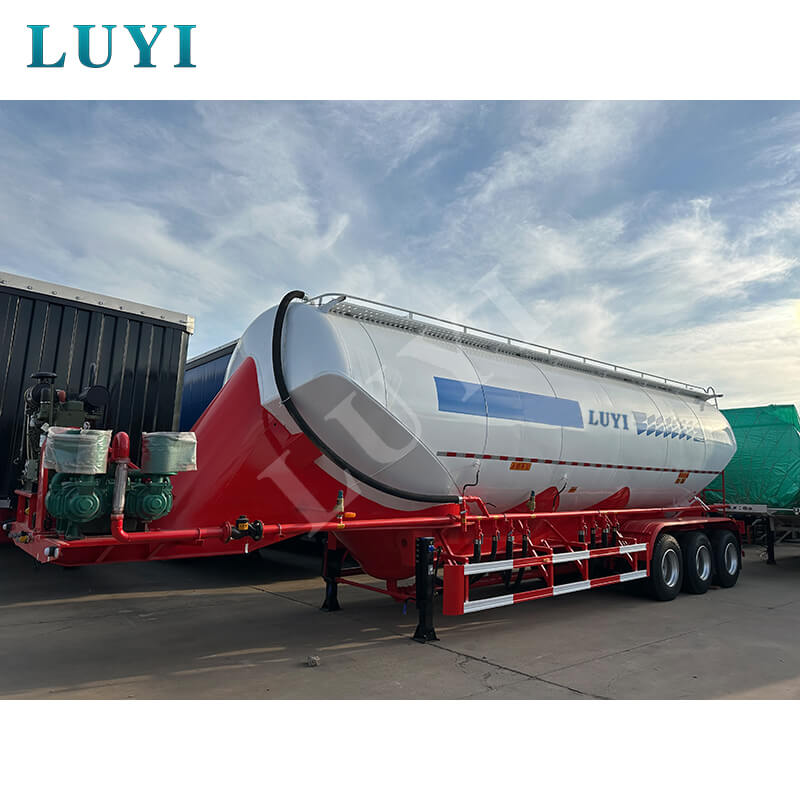 LUYI 3-Axle 50CBM Bulk V-Type Cement Cysterna Naczepa (zwana także cysterną proszkową), pochodząca z prowincji Shandong w Chinach, to naczepa specjalnie zaprojektowana do transportu luzem proszku cementowego. Nadaje się do scenariuszy z przyczepą ciężarową i zapewnia wydajne rozwiązanie w dziedzinie transportu materiałów budowlanych.