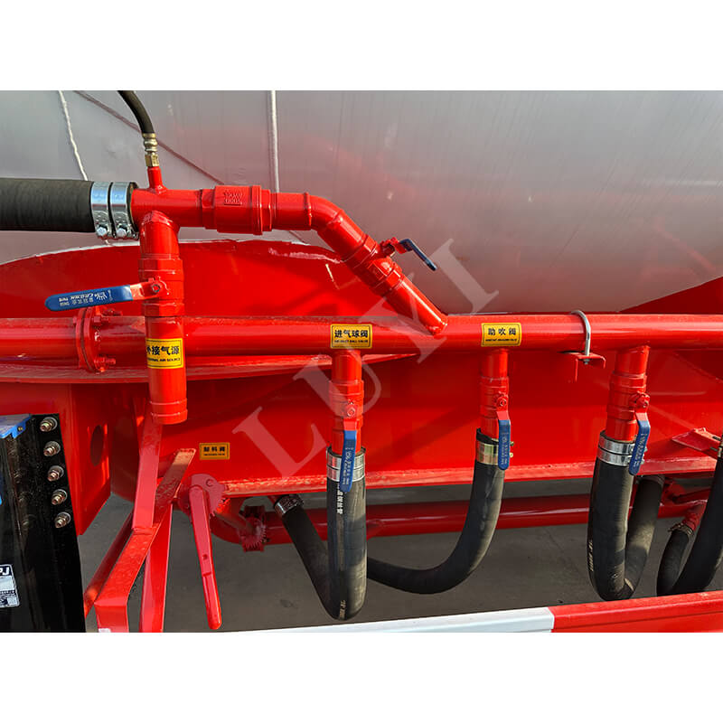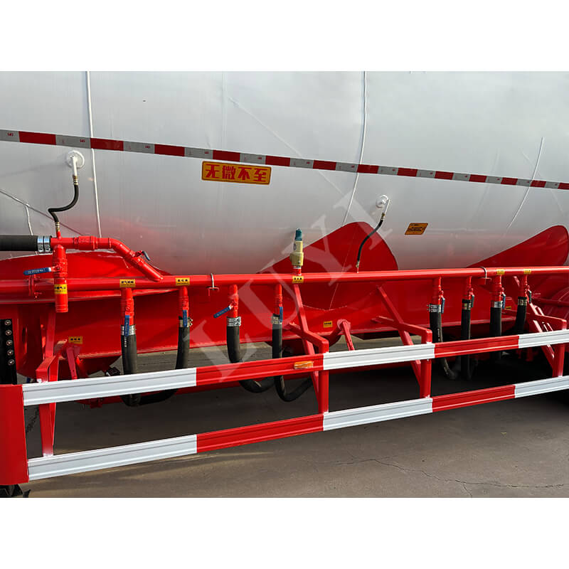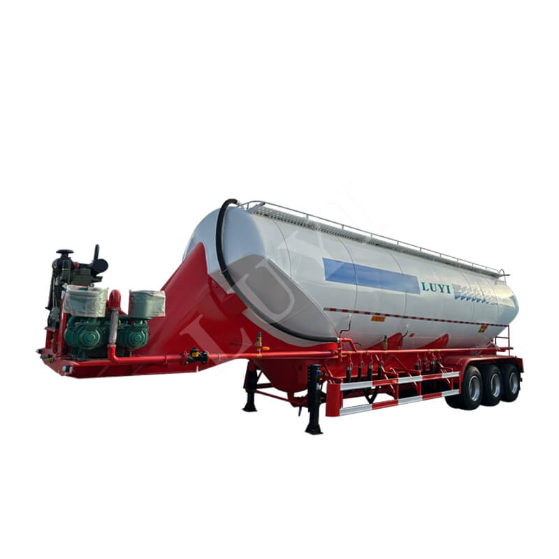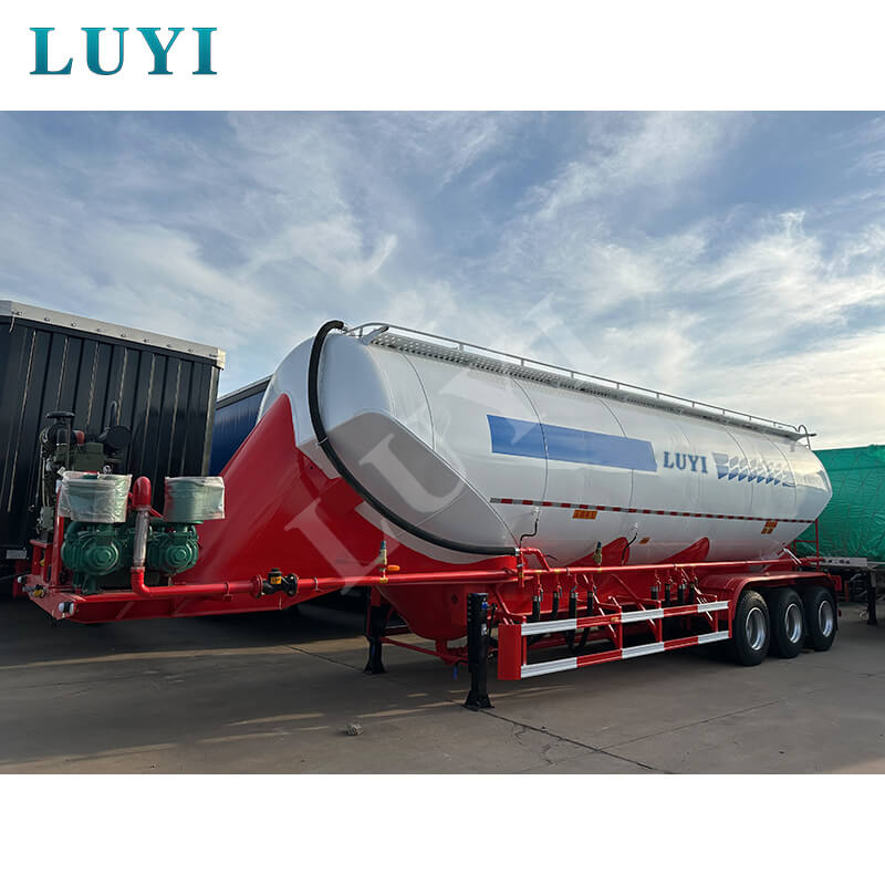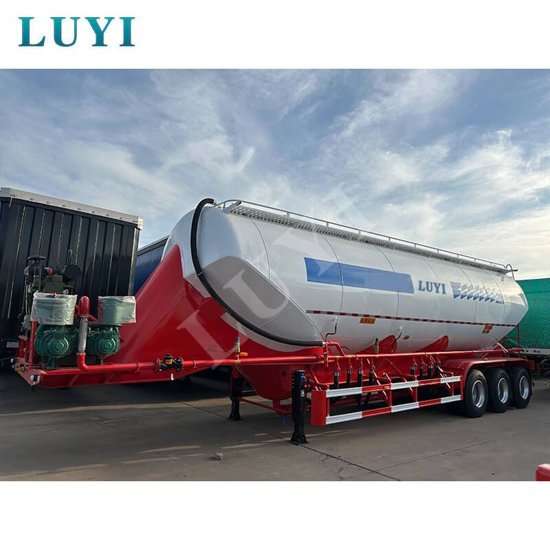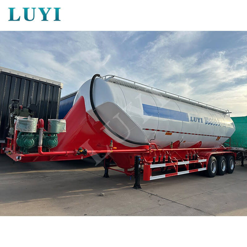 LUYI 3-Axle 50CBM Bulk V-Type Cement Cysterna Naczepa (zwana także cysterną proszkową), pochodząca z prowincji Shandong w Chinach, to naczepa specjalnie zaprojektowana do transportu luzem proszku cementowego. Nadaje się do scenariuszy z przyczepą ciężarową i zapewnia wydajne rozwiązanie w dziedzinie transportu materiałów budowlanych.