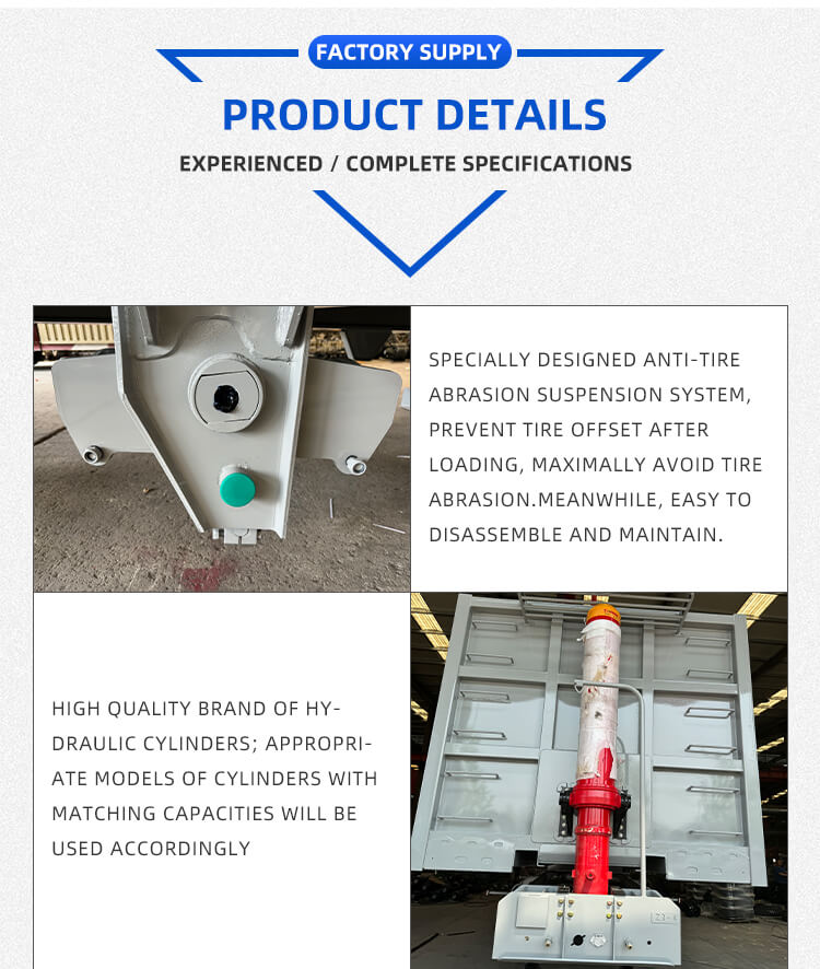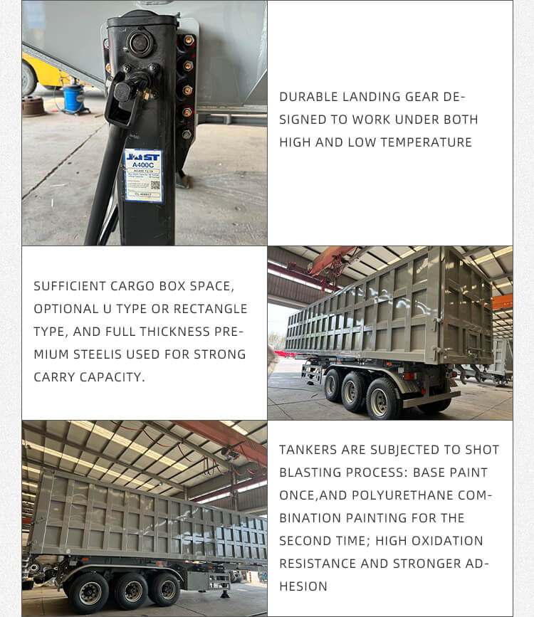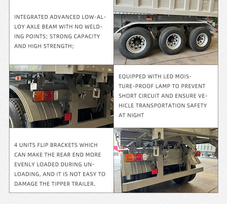 Oferuje elastyczne konfiguracje odpowiadające różnorodnym potrzebom: opcje osi obejmują osie 2/3/4 zaufanych marek BPW i FUWA oraz możliwość wyboru zawieszenia mechanicznego lub pneumatycznego zapewniającego stabilną jazdę. Wyposażony w opony 12R22.5, standardowe podwozie 28Ton i sworznie królewskie JOST 2"(50mm)/3,5"(90mm), zapewnia duże możliwości adaptacji. Proces malowania poliuretanem zwiększa trwałość, kolor można dostosować i jest objęty sześcioletnią gwarancją, co czyni go niezawodnym w przypadku długoterminowego transportu piasku i żwiru.