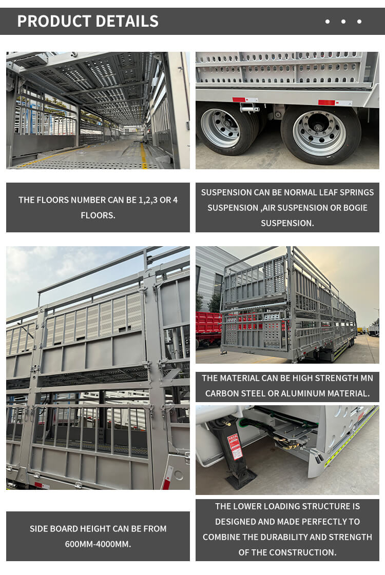 Zbudowana z aluminium/stopów przyczepa jest lekka, a jednocześnie trwała, a jej maksymalny efektywny ładunek wynosi ponad 30 000 kg, co pozwala z łatwością sprostać wymaganiom w zakresie dużych ładunków. W przypadku osi możesz wybrać wysokiej jakości marki, takie jak 13/16-tonowe FUWA, BPW i CIMC. Pasuje do opon w różnych specyfikacjach takich jak 11.00r20, 12r22.5, 315 i 385, natomiast układ zawieszenia oferuje dwie opcje: zawieszenie mechaniczne i zawieszenie pneumatyczne, zapewniające stabilną jazdę w zróżnicowanych warunkach drogowych. Kolor można dostosować do wymagań klienta, a także jest objęty roczną obsługą posprzedażną, w pełni odpowiadającą scenariuszom transportu i spersonalizowanym potrzebom, co czyni go idealnym wyborem do transportu zwierząt gospodarskich i ładunków masowych.