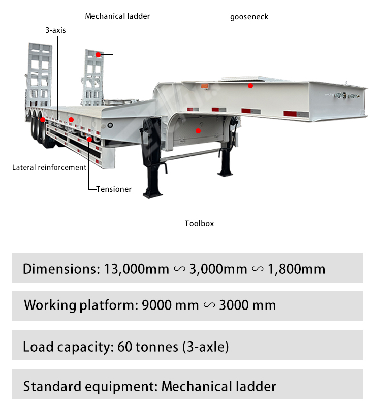 Wyposażona w 3 wysokiej jakości osie oraz opony 12R22,5, przyczepa zapewnia stabilną jazdę i równomierny rozkład obciążenia, skutecznie ograniczając zużycie podczas długich tras. Układ zawieszenia oferuje dwie opcje: zawieszenie mechaniczne i zawieszenie pneumatyczne, umożliwiające elastyczne dostosowanie do różnych scenariuszy transportu, przy jednoczesnym zrównoważeniu praktyczności i komfortu. Standardowy sworzeń królewski JOST o średnicy 2 cali (50 mm) lub 3,5 cala (90 mm) zapewnia bezpieczne i niezawodne połączenie, gwarantując bezpieczeństwo transportu. Standardowe podwozie o masie 28 ton zapewnia stabilne podparcie, ułatwiając łatwy załadunek i rozładunek.