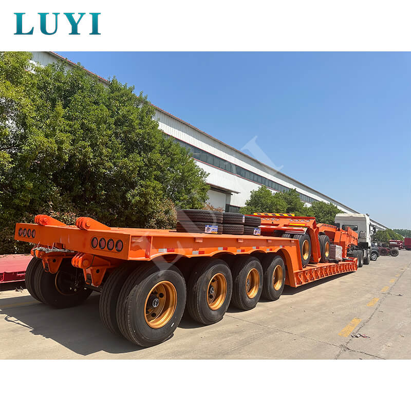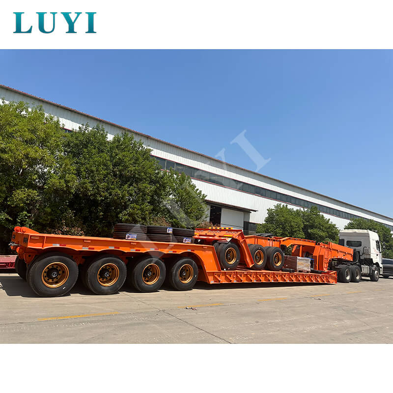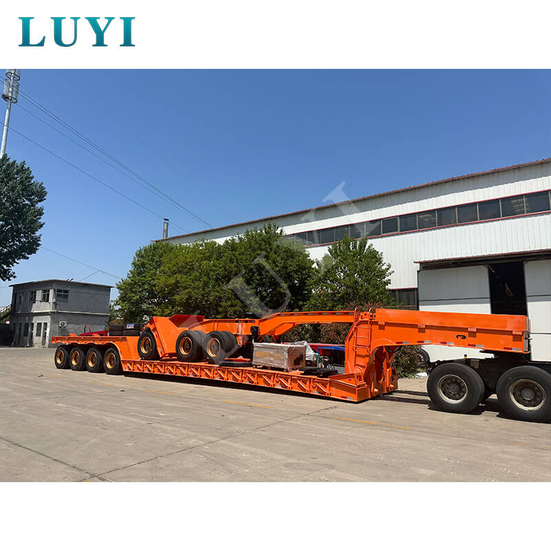 4-osiowa naczepa Lowboy o udźwigu 100 ton typu „gęsia szyja” firmy LUYI VEHICLE to wysokowydajna przyczepa do samochodów ciężarowych pochodząca z prowincji Shandong w Chinach. Wykonana z wysokiej jakości stali, w głównej belce zastosowano stal T700/Q345, co zapewnia solidną i trwałą konstrukcję. Dzięki nośności 100-120 ton i maksymalnej efektywnej ładowności 120 000 kg z łatwością spełnia potrzeby transportu ciężkiego.