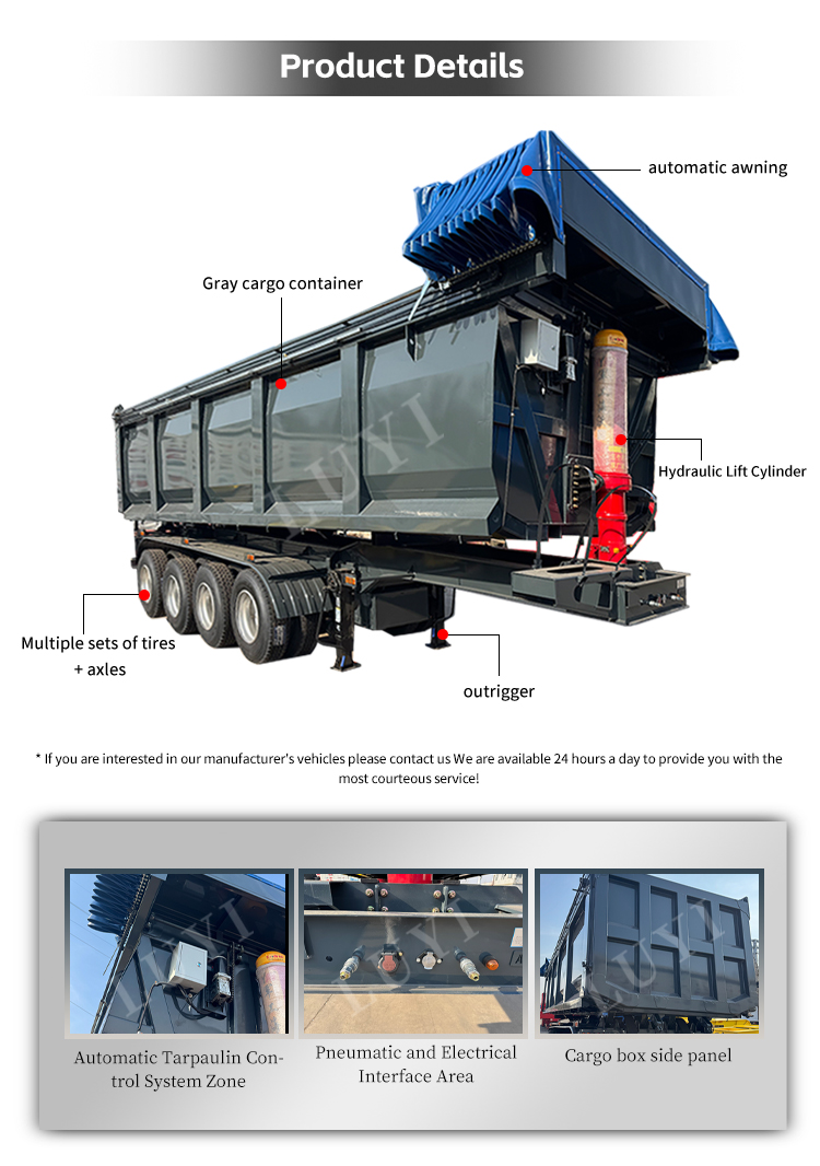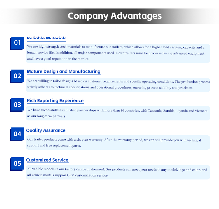 Zbudowany z piast kół ze stali węglowej Q345 o wysokości 500 mm i wzmocnionych belek głównych o nośności 70 ton, zapewnia dużą stabilność konstrukcyjną i długą żywotność. Skonfigurowany z opcjonalnymi osiami 4/6, pasującymi układami sprężyn mechanicznych lub zawieszenia pneumatycznego oraz oponami o wielu specyfikacjach, w tym 11.00R20, 12R20 i 315/80R22.5, radzi sobie stabilnie w różnych złożonych warunkach drogowych. Napędzana cylindrem hydraulicznym skrzynia wyładowcza w kształcie litery U umożliwia szybki i wydajny rozładunek. Dostępna jest możliwość dostosowania koloru, aby spełnić różnorodne wymagania klientów, co czyni go niezawodnym i trwałym sprzętem do transportu ciężkiego materiałów sypkich, takich jak piasek, żwir i węgiel.