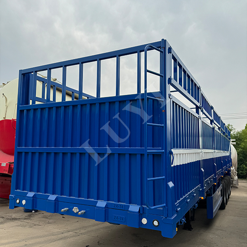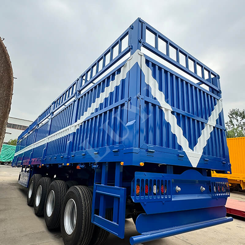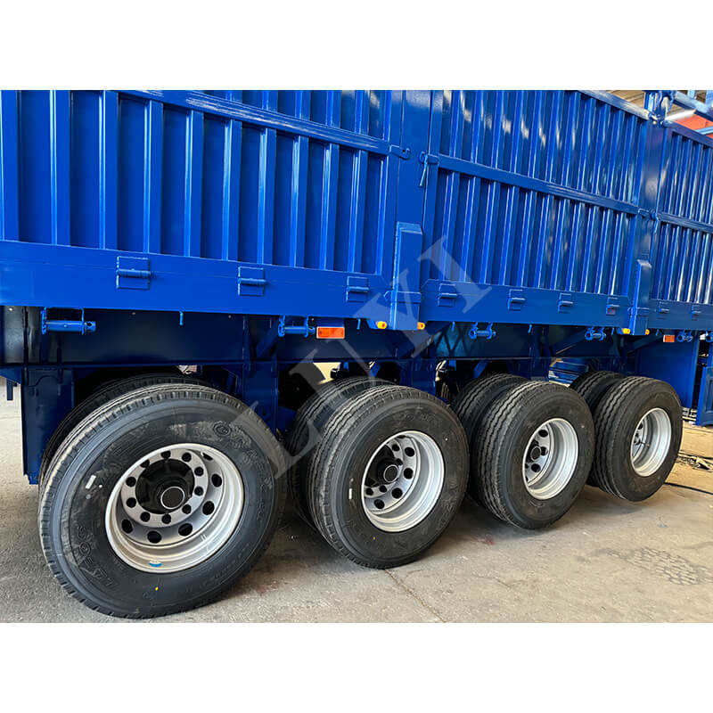 LUYI 4-osiowa naczepa płotowa z wywrotką boczną, nowy model naczepy o dużej wytrzymałości wyprodukowany w Chinach, jest wykonany z wysokiej jakości stali. Posiada ładowność 30 ton, nadaje się do transportu ciężkich towarów, takich jak inżynieryjne materiały budowlane i węgiel. Rozstaw osi pojazdu wynosi 7000-8000 mm, rozstaw kół 1820 mm, jest wyposażony w 3 osie, 12 opon i zawieszenie na resorach piórowych, co zapewnia dużą stabilność jazdy i z łatwością radzi sobie w trudnych warunkach drogowych.
