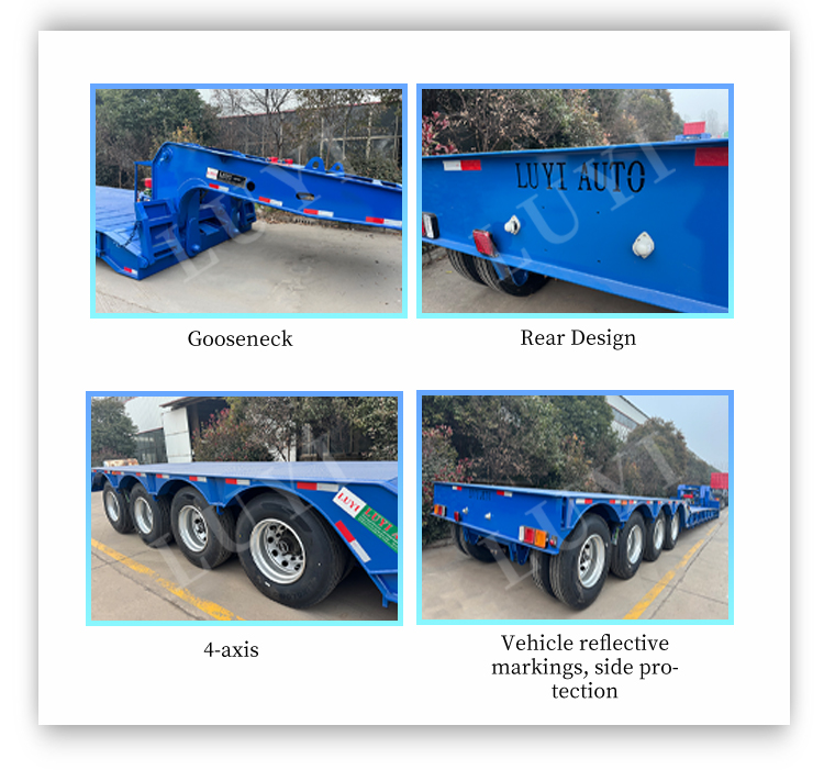 4-osiowa naczepa niskopodwoziowa LUYI typu "gęsia szyja" pochodząca z Shandong w Chinach to wysokiej jakości naczepa specjalnie zaprojektowana do transportu ciężkich ładunków. Zbudowany ze stali premium, ma masę własną wynoszącą zaledwie 6350 kg, nośność znamionową 50 000 kg i maksymalną ładowność w zakresie od 30 ton do 200 ton, co zapewnia wyjątkową nośność.