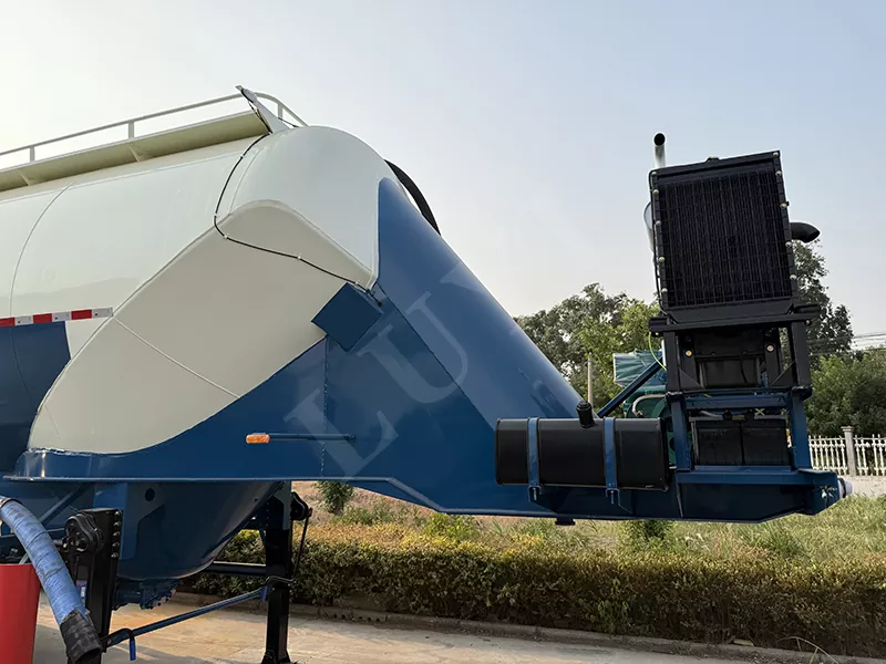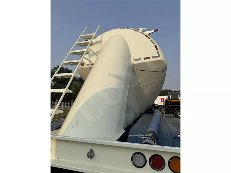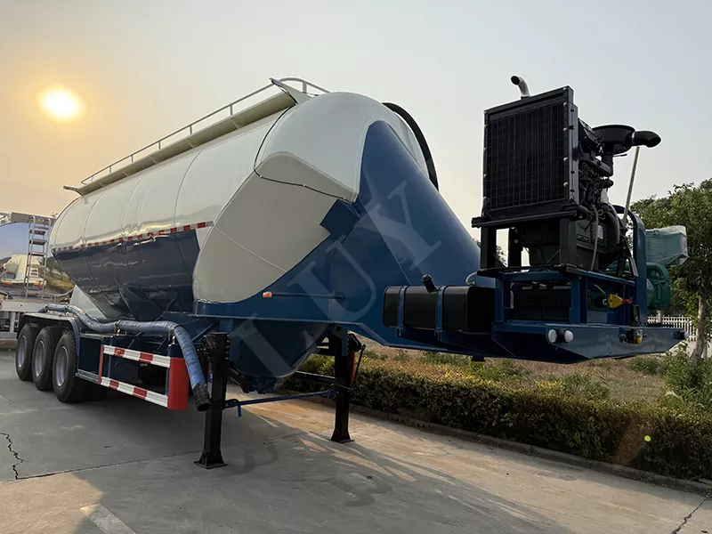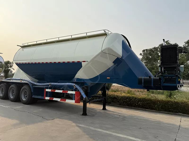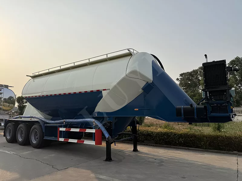 Całkowite wymiary naczepy z pionowym zbiornikiem na proszek o pojemności 48 metrów sześciennych wynoszą: 12400X2500X4000mm, pojemność zbiornika: 48 metrów sześciennych. Marka 3X13T Guangdong Fuhua lub marka BPW. Można zaprojektować opcjonalne opony z drutu stalowego lub opony próżniowe, opony pojedyncze i podwójne. 3-osiowe zawieszenie pneumatyczne lub zawieszenie mechaniczne, resory piórowe o dużej wytrzymałości, ABS Wabco. Podpory i sworznie trakcyjne Jost, zawory przekaźnikowe Wabco, obwody elektryczne 24 V, reflektory LED, rura tłoczna: przepustnica DN125, cały pojazd wykonany jest ze stali o wysokiej wytrzymałości, materiał głowicy zbiornika stożkowego: stal nierdzewna SS316, o wysokiej odporności na ciśnienie i długiej żywotności itp. Pionowa konstrukcja ma nisko położony środek ciężkości, dużą efektywną objętość ładunkową i komorę stożkową wewnątrz, która może ładować różne media, dużą kompatybilność i możliwość wyboru stożka, trzy stożki, cztery stożki lub sześć stożków i dolny otwór wylotowy.