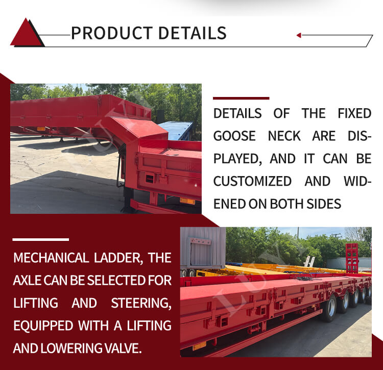 Zbudowany z wysokiej jakości stali węglowej lub aluminium, równoważy wymagania dotyczące trwałości i lekkości, oferując maksymalną ładowność 100 ton, co z łatwością radzi sobie z różnymi scenariuszami transportu ciężkiego sprzętu. Wyposażony w konstrukcję 8-osiową, oferuje opcjonalne osie marki Fuwa lub BPW, w połączeniu z układami zawieszenia mechanicznego lub pneumatycznego, zapewniającymi stabilność jazdy i bezpieczeństwo ładunku. Dostępne są trzy specyfikacje opon: 12R22.5, 12.00R20 i 11R22.5, odpowiednie do różnych warunków drogowych.