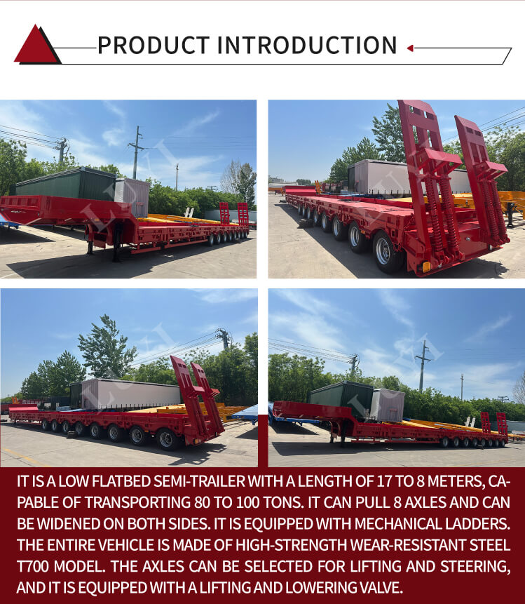 8-osiowa naczepa niskopodwoziowa z wysuwaną gęsią szyją i długością 17 m firmy LUYI, pochodząca z Shandong w Chinach, to naczepa o wysokich osiągach, zaprojektowana specjalnie do transportu ciężkiego sprzętu.