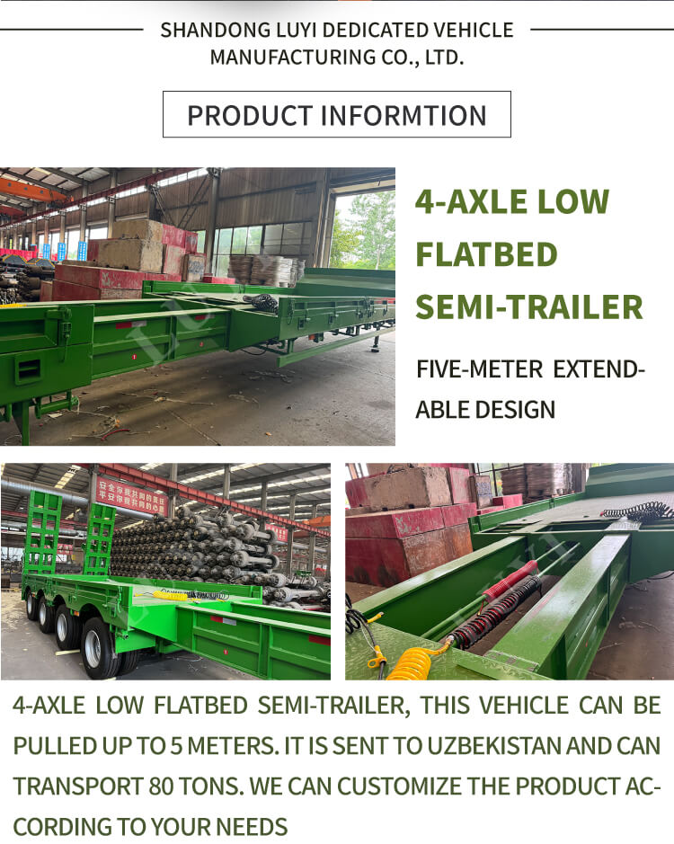 Naczepa niskopodwoziowa LUYI 4-Axle 60T typu „gęsia szyja”, wysokiej jakości ciężki pojazd transportowy z Shandong w Chinach, jest przystosowany do transportu ciężkiego sprzętu. Wykonany ze stali premium, ma wymiary 22000×3000×1600mm i maksymalną ładowność 60T, z łatwością radząc sobie z transportem różnych ciężkich maszyn.