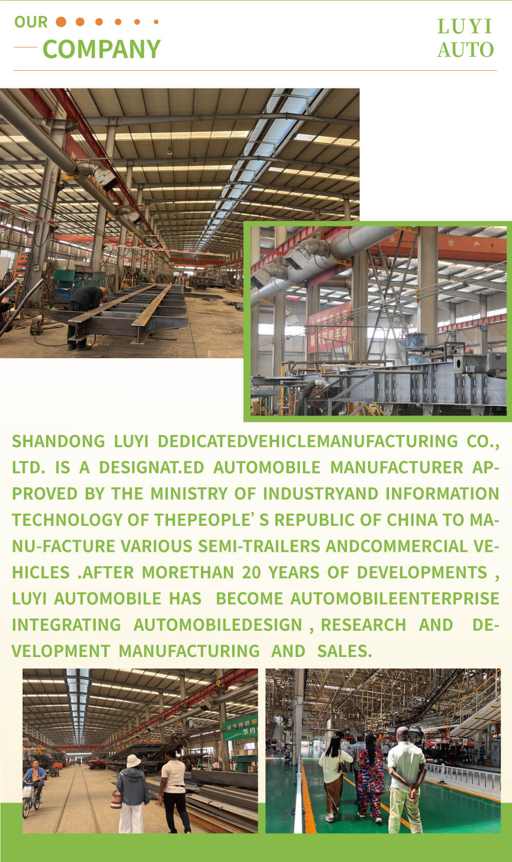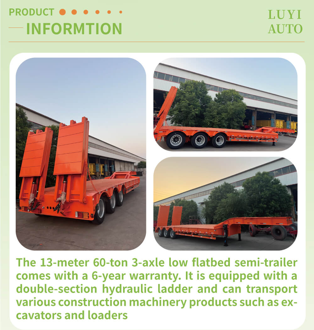 3-osiowa naczepa niskopodwoziowa LUYI o udźwigu 60 ton i zdejmowanej gęsiej szyi, produkowana w Shandong w Chinach, to profesjonalna przyczepa towarowa. Jego korpus wykonany jest ze stali o wysokiej wytrzymałości, o wymiarach 1700030001500mm. Konstrukcja jest solidna, a przestrzeń wystarczająca, co pozwala na stabilny załadunek ciężkich ładunków i przystosowanie się do różnych operacji trakcyjnych pojazdów ciężarowych